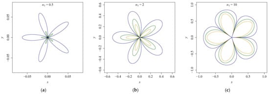 It is noted that the meanings of invariants have changed since the integrals do not always represent area or polar moment of inertia for a closed Gielis curve when m is any rational number, and the integrals may diverge with negative numbers n1, n2. On the other hand, the parameters n1 and n2 determine the shapes of the Gielis curves, which have different influences on the curves. The shapes tend to be fuller when the absolute value of n1 increases, and when the absolute value of n2 increases, the curves at φ = (2t + 1)π/m (t ∈ ℕ) become less flattened with n2 < 0 or n2 > 2, where r(φ) can take the maximal (or minimal) value. We can see that curves of various shapes are obtained when the absolute values of n1 and n2 are both large enough (Figure A1b, Figure A2b and Figure A3b). The shapes can be circles (Figure 4 and Figure 5) with n2 = 0 or 2, which indicates that the shapes tend to be circular whether n2 increases or decreases with 0 < n2 < 2. However, the shapes can be radiating lines or circles (Figure A1, Figure A2 and Figure A3) with n2 < 0 or n2 > 2 when the values of n1, n2 are large or small enough, which represents a limiting case of Gielis curves. In addition, whether r(φ) can reach its maximal or minimal value at φ = (2t + 1)π/m (t ∈ ℕ) determines the location of the corners. The corners of Gielis curves lie at φ = (2t + 1)π/m (t ∈ ℕ) if the points are maximal value points of r(φ), while the corners lie at φ = 2tπ/m (t ∈ ℕ) if the points are minimal value points.