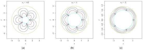 Gielis curves generated by Equation (3) for a = 1, m = 5. The values of n1 are −1 (a), −5 (b), −10 (c), respectively, and the values of n2 from the outside in are 2, 4, 6, 8 in each panel.