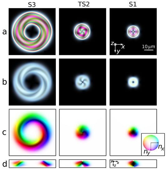 POM textures and director distributions for solitonic CLC structures S1, TS2, and S3. (a) White light POM textures in crossed polarizers computed at and []. Orientation of the axes for (a–c) and the white scale bar for all figures are shown in the inset at the left and the right of the texture for S1, respectively. (b) White light POM textures in crossed polarizers computed for the case of low birefringence with and []. (c) Director field distributions in the plane (the middle cross-section of the cell at ). The color palette in the inset at the right of the director distribution for S1 describes x and y projections of the director used in (c,d). This color wheel represents the northern hemisphere of director orientations where is non-negative. In the southern hemisphere, the colors become darker as decreases approaching the southern pole with . (d) Director field distributions in the plane with the origin placed at the center of the sample. Orientation of the axes is shown in the inset at the left of the distribution for S1.