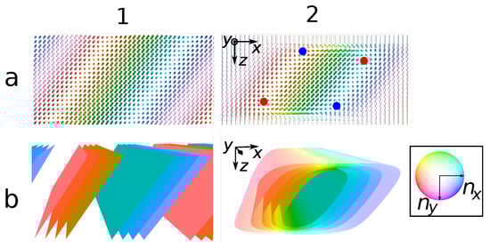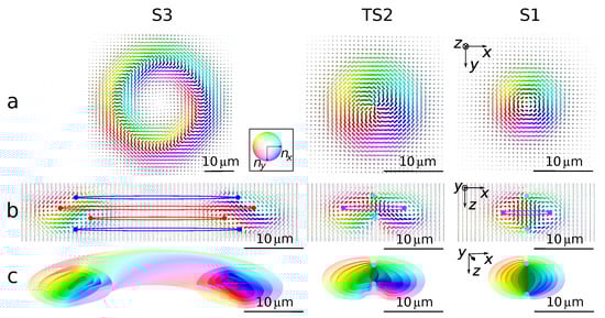 At the final stage, the spiral arms in the POM texture disappeared, and metastable state S1 was formed. The topology of the director field of this state is illustrated in Figure 2. It represents the well-known toron structure [,].