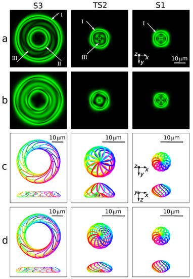 Approximated and simulated POM textures and director field distributions for localized topological structures S3, TS2, and S1. (a,c) Results for approximated (designed) structures using analytical ansatz (12) (see text for the list of parameters). (b,d) Results for the simulated structures from the lattice model. (a,b) Green light POM images in crossed polarizers at the 532 nm wavelength for and . Orientation of the axes and the white scale bar for (a,b) are shown in the inset at the left and the right of the texture for S1, respectively. (c,d) Isolines for the z projection of the director in the and the planes. Orientation of the axes for (c,d) is shown in the insets at the left of the distributions for S1. Chiral arms are marked as Region III, whereas Regions I and II indicate outer and inner bright rings, respectively.
