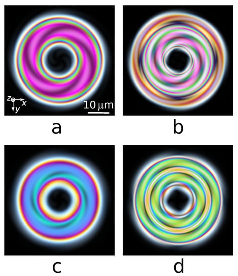 - Loussert, C.; Brasselet, E. Multiple chiral topological states in liquid crystals from unstructured light beams. Appl. Phys. Lett. 2014, 104, 051911. [Google Scholar] [CrossRef]