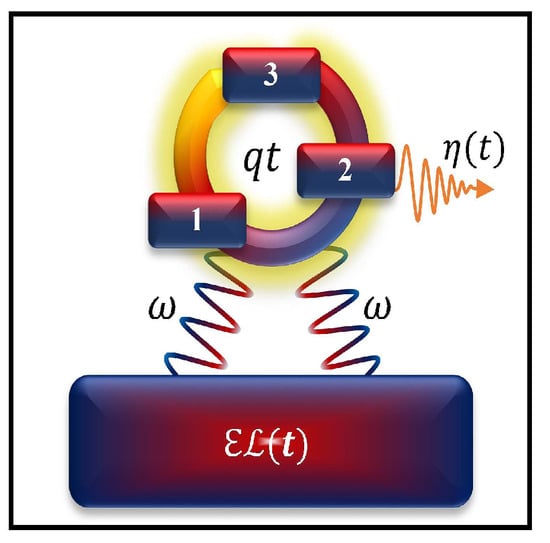 This section summarizes the required mathematical operations. We focus on the dynamical map of coherence in a three-level system that exists initially and which then evolves in classical fields of fluctuating nature driven by distinct Gaussian noises (see Figure 1). The Hamiltonian that governs the system’s present dynamical map can be stated as [25]: