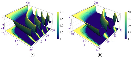 To analyze the coherence qualitative dynamical map for the time-evolved density matrix of the system given in Equation (17), we use the -norm of coherence, which can be computed as [36]: