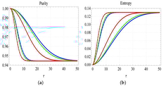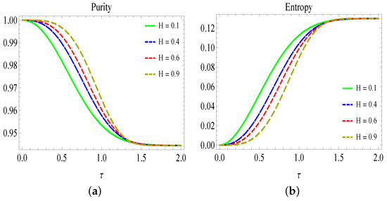 Figure 4 explores the dynamics of the purity and von Neumann entropy for a single qutrit system under the local . By comparing Figure 2, Figure 3 and Figure 4, the destructive nature of the towards the revivals and preservation of the coherence and information is obvious enough. Purity and coherence, because of , attain final saturation values after undergoing maximum decay. It is important to recall that the present saturation levels only reflect a small partial loss of coherence and information. This is both startling and counterintuitive to most previous results for systems with multiple qubits or qutrits [57,67,68], where a greater loss of information has been observed. This means that once the information is lost, then this noise does not facilitate the repeated interchange of information between the system and the environment. One might deduce that the information degradation is irreversible and cannot be reversed, as also shown in [57,77,78,79,80], where a temporary reversible decay occurred. The dynamics of the bipartite and tripartite states under , and pure and mixed Gaussian noises have the same monotonic qualitative decay; through with different decay levels or reaching complete separability [57,77,78,79,80]. We find it distinct that, for increasing choices of H, the slopes shift from the green to the red end. This implies the supporting nature of the parameter H for memory properties of the environments, and the opposite results have been obtained while discussing different noise parameters, such as in [57,67,77,78] where decay increases with the increase in the noisy parameters. All of the parameter values overlap at the peaks and minima, indicating that both measures suggest a single saturation level, and therefore they predict a good agreement between them. The current noise parameters do not affect the loss in this case, but the noise phase has an enormous impact. Adjusting the parameters has only a minor impact on the preservation duration, and any choice of H does not guarantee that the coherence and information will be preserved. Because of the discrete nature, we found no ultimate solution or ideal parameter fixing to avoid the noisy detrimental effects. Avoiding classical environments with discrete Brownian motions of the relative constituents is the only method to reduce this type of noise. The -function for is computed to be . Within classical environments with disorders, these precise values will be useful in optimizing quantum correlations and the coherence survival time.
