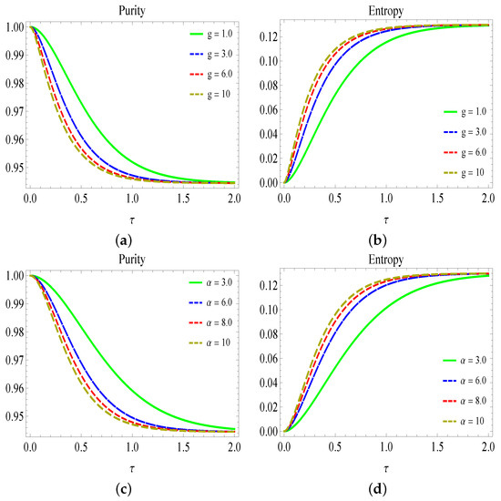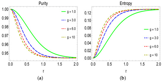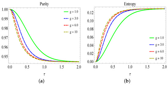 Figure 5 shows the dynamics of purity and von Neumann entropy for a single qutrit system when subjected to the classical field with . The system’s time evolution is investigated further for various g values against . By comparing Figure 2, Figure 3 and Figure 5, one can deduce the dominating deteriorating character of the to the lower preservation capacities and vanishing revival features of the environments. Due to , the initially encoded purity and coherence in the system showed a monotonic decline rather than showing any rebirths. As a result, the classical random field with does not allow information from the environment to flow back into the system. One can deduce that the degradation produced by is irreversible. The observed qualitative behaviors for bipartite and tripartite states are consistent with the previous results obtained under various kinds of Gaussian noises studied in [57,77,78,79,80]. However, the related quantitative analysis has many differences, such as a greater loss and preservation time. When g increases, the slopes move from the green to the red end. For large values of g, this means a higher occurrence of purity and coherence loss. Due to , the decay encountered is incompatible with this behavior. It is important to note that under , the coherence and information are not lost entirely and they reach a final saturation level after maximal decay. This property of the single qutrit system, which shows a minimal partial loss rather than a complete loss, is a useful resource that contradicts most of the previous findings obtained for bipartite and tripartite qubit systems in [57,66,76,77,78,79,80], where the quantum systems become easily decoherent. According to both measures, the saturation levels for each value of the noise parameter meet at the same height, implying that the decay levels are the same. The measures’ maxima and minima are comparable, showing that the results are consistent. In addition, the noise phase is less decoherent towards the coherence and information decay than the noise phase. Unlike the , the exhibits flexible noise parameter range values. This makes it easier to characterize the classical environments with for optimal longer quantum correlations and coherence preservation times. For , the corresponding -functions for the current noise have the values of .