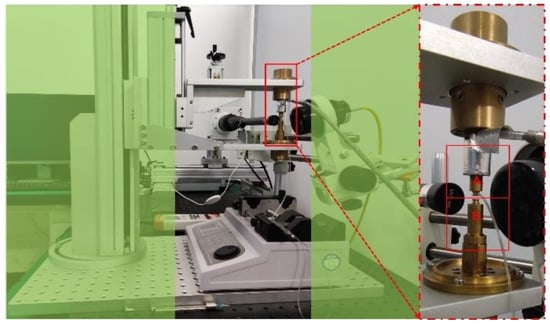 As shown in Figure 1, the experimental platform mainly includes the liquid bridge generation system, image acquisition, and analysis system. The experimental instruments include a high-speed camera (shooting rate: 5200 fps), a macro close-focus lens, Macro Probe Laowa, an adjustable laser transmitter, a moving bracket for the high-speed camera, and a liquid bridge rotating bracket. The moving bracket of the high-speed camera and liquid bridge rotating bracket can achieve synchronous rotation. In the experiment, KF96-10cSt methyl silicone oil was selected as the liquid bridge medium, and the parameters are shown in Table 1.