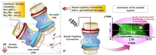 - Zuev, A.L.; Kostarev, K.G. Certain peculiarities of the solutocapillary convection. Physics-Uspekhi 2008, 51, 1027–1045. [Google Scholar] [CrossRef]