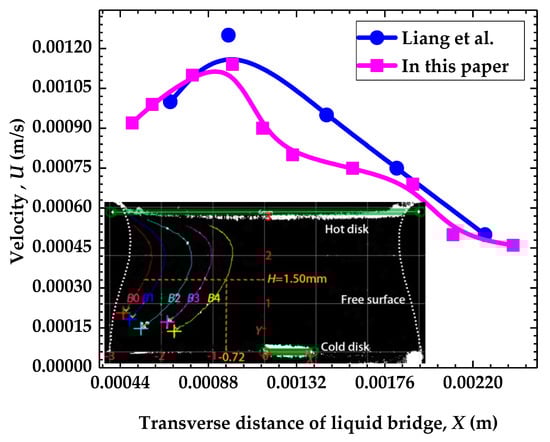 A comparison of the current results with the available experimental data (Liang et al., 2019) [] was done under the same conditions, by prescribing a non-isothermal liquid bridge of 5cSt silicone oil with R = 3 mm, H/R = 1, and ΔT = 9.5 °C. Figure 3 shows the distribution of the transverse velocity component along the radius at the intermediate height (the velocity was extracted by the open-source PIVlab). Although there are some differences between the two results, they have the same order of magnitude—10−4~10−3. In addition, the solutocapillary convection dominated by the concentration gradient is weaker than the thermocapillary convection dominated by the temperature, so the velocity magnitude drops to 10−5~10−4 in the following discussion.