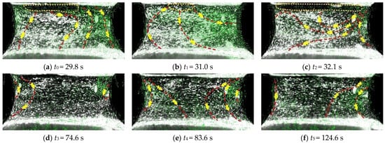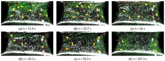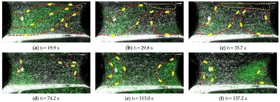 Figure 4 shows the flow pattern evolution of the solutocapillary convection under the 0° gravitational tilt angle. The area enclosed by the dotted yellow line represents the injected solute zone; the yellow arrow notes the flow direction of the cell flows; and the enclosed area with the red dotted line notes the flow structure in the annular cells. In Figure 4a,b, hexadecane was injected into the liquid bridge. Since the density of hexadecane is less than the density of 10cSt silicone oil (ρsol = 774 kg/m3 < ρ10cSt = 935 kg/m3), the solute accumulates at the injection location (near the left of the upper disk). The solute diffuses freely along the upper disk of the liquid bridge. At the same time, the large-scale bulk flow due to the counterclockwise moving of the solute occupies the entire liquid bridge. At the time of t2 = 36 s, the solute diffuses to the entire upper disk (as shown in Figure 4c); the solutocapillary convection forms due to the interfacial concentration gradient; and the bulk flow on the right side is separated into a reverse cell flow. Figure 4d–f shows the development of the solutocapillary convection. At the time of t3 = 45.2 s, the solute concentration gradient increases at the upper corner, causing an uneven surface tension gradient along the free interface, as shown in Figure 4d.