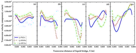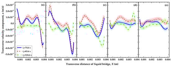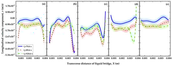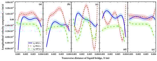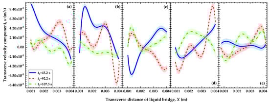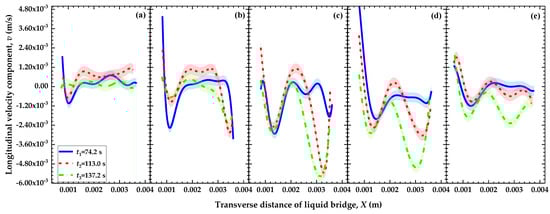 The surface tension of hexadecane is always greater than that of silicone oil at the same temperature (the surface tension of hexadecane and 10cSt silicone oil are, respectively, σ = 25.81 mN/m, and σ = 19.93 mN/m, at T = 25.6 °C), so the hexadecane as the solute will increase the surface tension of the local free interface. The surface tension near the upper disk is greater than that at the other positions. Therefore, the half-moon-shape cell flow (“Ͻ”-shape) is first formed near the interface at the upper corner; it is counterclockwise rotating on the left side, and it is clockwise rotating on the right side. At this time, the structure of the solutocapillary convection is small in scale, and the differentiated reverse bulk flow is below the solutocapillary convection. At the time of t4 = 92.2 s, as the hexadecane diffuses from the upper corner to the bottom disk, the concentration gradient along the free surface gradually increases. The solutocapillary convection gradually develops and moves toward the intermediate height, as shown in Figure 4e. At the time of t5 = 107.3 s, the solute concentration gradient gradually decreases along the liquid bridge interface. The solutocapillary convection gradually shrinks and moves to the bottom corner until it disappears (see Figure 4d). The solid lines represent the average transverse or longitudinal velocity component at the three moments (t1′ = 45.0 s, t1″ = 45.2 s, and t1‴ = 45.4 s; t2′ = 92.0 s, t2″ = 92.2 s, and t2‴ = 92.4 s; t3′ = 107.0 s, t3″ = 107.3 s, and t3‴ = 107.6 s). The error band was calculated by the standard deviation between the mean and the transverse or longitudinal velocity component (ti, ti″, and ti‴). In the initial stage of the solutocapillary convection (at the time of t3 = 45.2 s), the surface tension gradient near the upper disk is larger than that in the other positions, and it is close to the upper corner. Therefore, the average level of the transverse velocity component near the upper disk (y = 1.7 mm, y = 1.5 mm, and y = 1.2 mm) is significantly larger than that near the bottom disk (y = 0.9 mm and y = 0.6 mm). There is a set of obvious positive and negative alternating transverse velocity peaks at the height of y = 1.2 mm. As the solutocapillary convection develops, the bulk flow disappears at the time of t4 = 92.2 s, and the solutocapillary convection moves toward the intermediate height (y = 1.2 mm), resulting in a significant variation in the transverse velocity component near the upper or bottom disk.