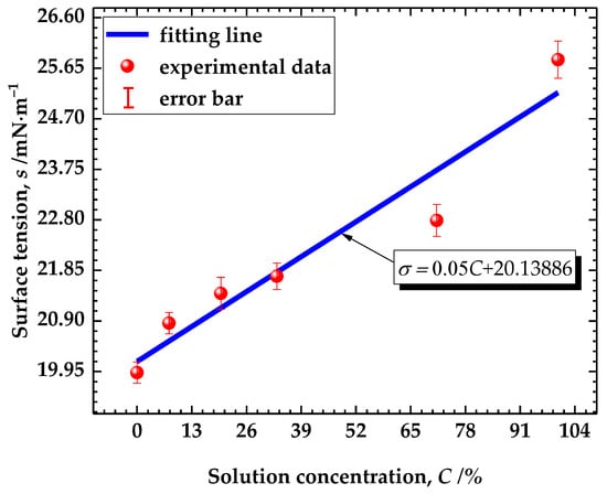 Usually, surface tension is a linear function of the concentration, σc(C) = σ0(C0) − γc(C − C0), where C0 is the solution concentration at the initial moment and γc = (∂σc/∂C)|T, σ0 is the surface tension at the concentration C0 (T0 = 25.6 °C), σ0 = 19.93 mN/m. In this experiment, the silicone oil with 20 μL is the base solution of the liquid bridge, and the hexadecane (2 μL) is the solute. Since they don’t meet the minimum solution volume of the instrument, the surface tension of the mixed solution is determined based on the similarity principle (the 3 mL hexadecane was mixed with 1 mL, 5 mL, 10 mL, and 30 mL of 10cSt silicone oil to obtain the mixed solution). As shown in Figure 13, the surface tension becomes larger with increasing concentrations, nevertheless, the variation trend of the surface tension of the liquid bridge during the solute diffusion is the opposite of the above.