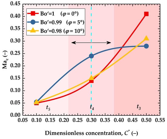 As shown in Figure 14, with the application of the gravitational tilt angle, the static Bond number gradually decreases; the buoyancy effect caused by the gravitational field weakens (Bo′ < 1); and the interface morphology is dominated by the capillary forces. With the decay of the concentration gradient, the solute Marangoni number decreases. The axial component of the Bond number decreases in a small range by the internal energy instability, however, which has a significant effect on the Marangoni number. In the initiation stage of the solutocapillary convection, the decay rate of the Marangoni number decreases with the increasing Bond number. In the development stage of the solutocapillary convection, the decay rate of the Marangoni number increases with the increasing Bond number.