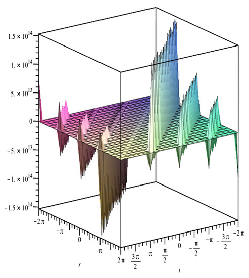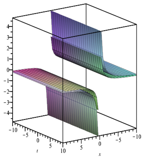 where and are constants to be determined, and the functions and satisfy Equations (67) and (68). Substituting (75) into (73), we obtain a system of algebraic equations for and . We solve these algebraic equations with the aid of Maple. Therefore, we obtain the following formulae of the traveling wave solutions of Equation (73):