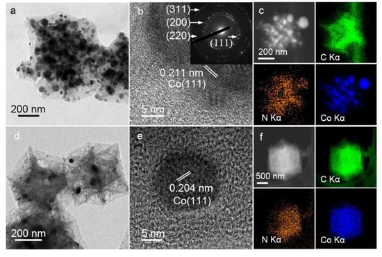 Transmission electron microscopy (TEM) was utilized to further analyze the microstructure and phase information of the catalysts. Figure 1a,d shows typical low-magnification TEM images of the ZIF800 and ZIF800H-Anneal. The grain size of the ZIF800H-Anneal was smaller than that of the ZIF800, which also confirmed the porous structure of the ZIF800H-Anneal after annealing. Specifically, cobalt species can be divided into larger-sized asymmetric (exposed and buried by carbon) Co (Asy-Co) species (~40 nm) and smaller-sized symmetric (fully buried by carbon) Co (Sy-Co) species (~15 nm). These graphitic layer-coated Sy-Co nanoparticles are inaccessible to hydrochloric acid because they are still encapsulated completely in the graphitized carbon shell. In addition, high-resolution TEM (HRTEM) images were used to characterize the phase structures for the cobalt species (Figure 1b for the ZIF800 and Figure 1e for the ZIF800H-Anneal). Figure 1b shows that the Sy-Co nanoparticles by carbon coating had lattice stripes corresponding to the Co (111) plane and an interplanar spacing of 0.211 nm, which is well matched to the (111) plane of Co (PDF #15-0806) in the Fm-3m space group [17]. As shown in Figure 1c, the EDS spectrum demonstrated a uniform distribution of Co, N and C. After acid etching and annealing, the crystal plane spacing of the ZIF800H-Anneal was reduced. For example, the crystal plane spacing of Co (111) reduced from 0.211 to 0.204 nm. It might be due to the oxidation of a small number of Asy-Co particles near the surface, which were exposed to oxygen and partly oxidized into cobalt oxide during the first annealing. However, the acid etched the exposed Asy-Co species and cobalt oxide species, but the acid could not contact the carbon-coated Sy-Co species. Figure 1f shows the EDS elemental mapping of the ZIF800H-Anneal, and Co, N and C were distributed uniformly.