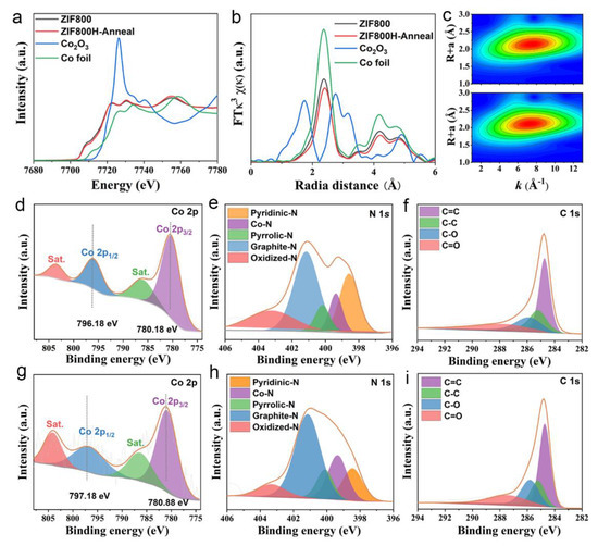 Structural and compositional characterization of ZIF800 and ZIF800H−Anneal. X−ray fine structure analysis of (a) XANES spectrum, (b) EXAFS spectrum and (c) WT−EXAFS spectrum for Co K edge. High−resolution XPS spectra for (d) Co 2p, (e) N 1s and (f) C 1s for ZIF−800 and (g) Co 2p, (h) N 1s and (i) C 1s for ZIF800H−Anneal.