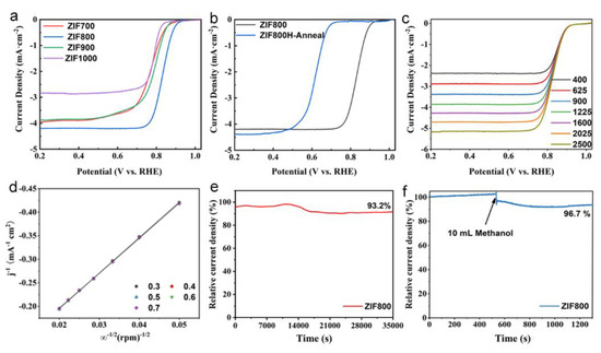Electrochemical oxygen reduction on ZIFs. (a) LSV curves of ZIF700, ZIF800, ZIF900 and ZIF1000 (1600 rpm). (b) LSV curves of ZIF800 and ZIF800H−Anneal (1600 rpm). (c) LSV curves of ZIF800 in O2−saturated 0.1 M KOH solution with different rotation rates (400-2500 rpm). (d) Koutecky–Levich plots of ZIF800 at different potentials, where ω is the rotation speed. (e) I-t stability testing curve to evaluate the stability of ZIF−800. (f) Anti-methanol poisoning ability testing for ZIF−800.