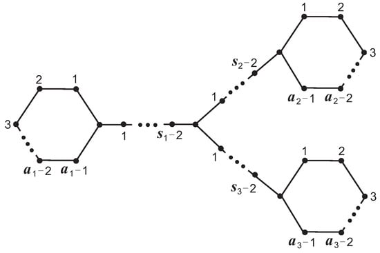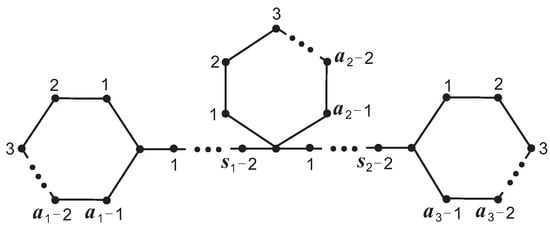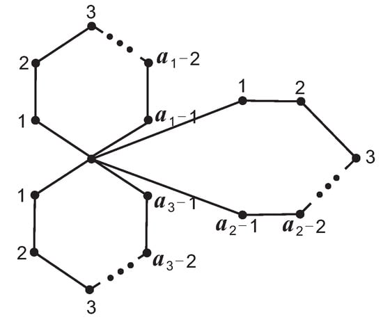 We know that a connected graph G is a tree, unicyclic graph, bicyclic graph and tricyclic graph if and only if and , respectively. When the starting vertices of three paths , and are conglutinated into a vertex and the end vertices are conglutinated into a vertex, the resulting graph is called a graph and is denoted as . The graph formed by the two end vertices of a path conglutinating into a vertex on the cycle and is called a graph, denoted as (see Figure 7).