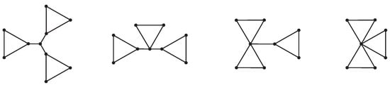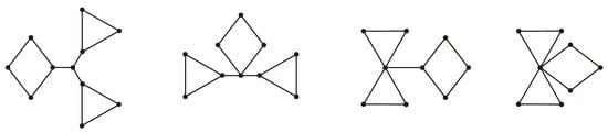 From Theorem 1, Corollaries 1–3, we know that the graph , (, or ) is singular if the length of a cycle on the graph G is a multiple of 4. The smallest singular graph of the number of vertices in (, , ) graphs is (, , ), and it has 11 (10, 9, 8) vertices (see Figure 5). The smallest non-singular graphs of the number of vertices in (, , ) graphs is (, , ), and it has 10 (9, 8, 7) vertices (see Figure 6). From Theorem 2, we were surprised to find that more than half of the (, , ) graphs were singular.