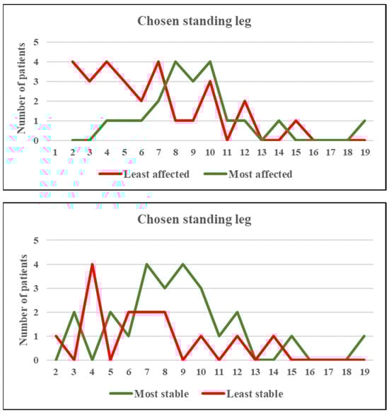 A comparison of stance duration between the two groups failed to show any significant difference when patients stood on their spontaneously chosen leg or on their most stable one (Table 3). On the contrary, stance duration differed between the two groups when standing on the leg opposite to the spontaneously chosen one, or on the least stable (ps < 0.05). In both cases, stance duration in G1 greater than in G2, in line with the correlational outcomes in the whole sample.