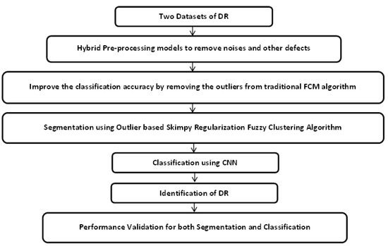 This research study employs a series of preprocessing, segmentation, and classifying stages. The first step of the study is to correct and use all of the undesired noise, size variants, and colour variants in the process. The novelty of the work lies in the segmentation process, where a novel skimpy fuzzy c-means algorithm is projected in this research work. Current fuzzy clustering image segmentation techniques have a fundamental shortcoming, and the proposed OSR-FCA has been used to address this issue. With regard to the OSR-objective FCA’s function, it includes a regularisation term that helps it achieve scanty fuzzy clustering because it takes into account both the sparsity of membership and how fuzzy it is. Furthermore, the research model was able to efficiently merge small regions, which resulted in outstanding image segmentation. The experimental consequences proved that the projected OSR-FCA technique achieved 97.16% of accuracy on the first dataset and 97.26% of accuracy on the second dataset, where the proposed CNN model achieved 97.26% of accuracy on the first dataset and 98.70% of accuracy on the second dataset, but the existing models achieved nearly 92% to 95% of accuracy on both datasets. The proposed results will be improved in future work by developing a new model for DR image classification.