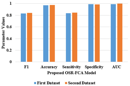 The existing FCM such as basic model, multi-scale, and multi-path achieved 97% of accuracy, multipath, multi-scale, and multi-output fusion FCM achieved 96% of accuracy and finally the proposed model achieved 97.26% of accuracy. In the analysis of AUC, all the existing FCM techniques achieved 98%, where the proposed model achieved 99.90% of AUC. The specificity of proposed model is 98.52%, sensitivity is 84.28%, and F1-measure of OSR-FCA model is 84.20% on second dataset. Figure 4 presents the graphical representation of proposed model in terms of various metrics on two publicly available dataset.