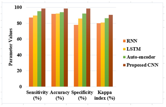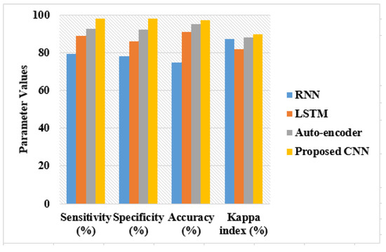 In the first dataset, the proposed CNN model achieved 97.26% of accuracy, the auto-encoder, and LSTM models achieved nearly 91% to 95% of accuracy, but the RNN achieved very low performance, i.e., 75.03% of accuracy. The reason for the poor performance of RNN is that it is very slow and has complex training procedures. Moreover, it is difficult to process the longer DR sequences. In the analysis of the Kappa index, all existing techniques such as RNN, LSTM, and auto-encoder achieved nearly 81% to 88%, where the proposed CNN model achieved 90.07%. The auto-encoder achieved 92% of sensitivity and specificity, the RNN achieved nearly 78% of sensitivity and specificity, and the LSTM model achieved nearly 87% of sensitivity and specificity. However, the proposed CNN model achieved 98.04% sensitivity and 98.17% specificity. Figure 6 presents the graphical representation of the proposed CNN model on a second dataset called IDRiD in terms of various metrics.
