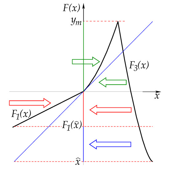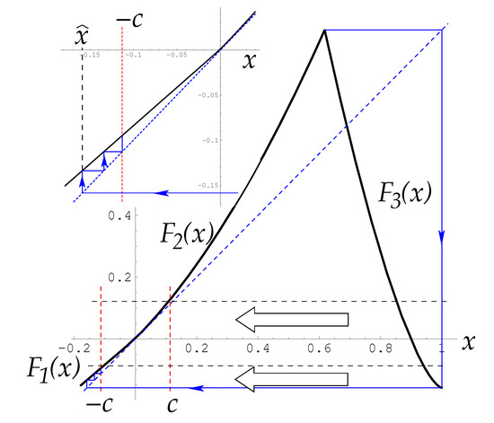Figure 1 shows how the intervals are mapped to obtain Equations (3)–(5). Blue, red, and green arrows correspond to Equations (3)–(5), respectively. Furthermore, Figure 1 and Equations (4) and (5) show that there is symmetry in the process of density evolution.