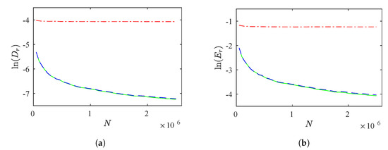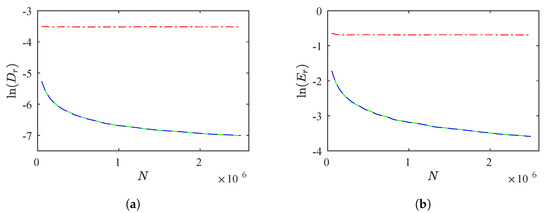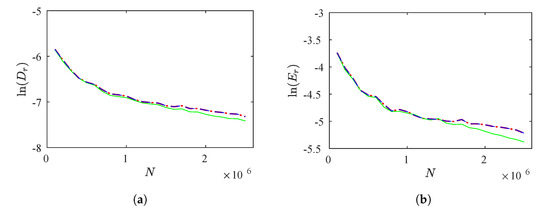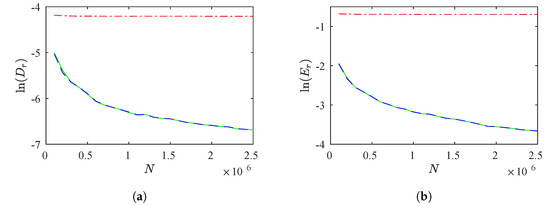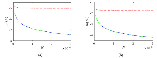 Figure 4a,b show and for a number of reinjected points, respectively. For these figures, we use N from to and . We can observe that the differences between RPDs calculated with the continuity technique and the M function methodology with numerical data decrease while N increases. However, this behavior is not verified by the classical RPD.