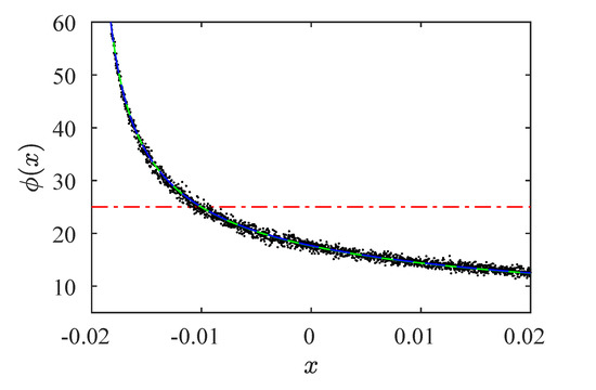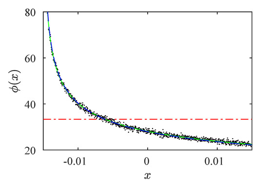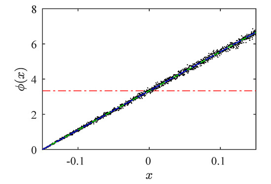 For all tests in this section, the following parameters are used , , and . Thus, the reinjection process is driven only by . The reinjected points in the laminar interval, , are mapped only by from points in the interval . For the first test, we also use , , and . To obtain the RPD function, we consider Equation (21), and it results