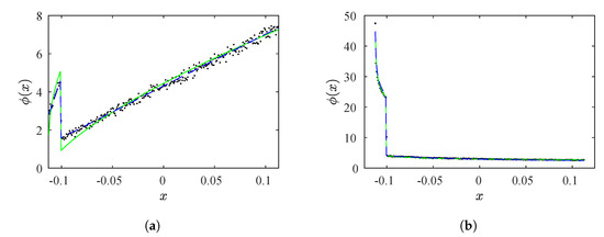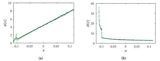 Discontinuous RPD function for , , , . (a) . (b) . Green line: M function methodology. Blue line: continuity technique. Black points: numerical data.
