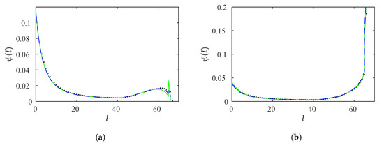 RPDL function for , , , . (a) . (b) . Green line: M function methodology. Blue line: continuity technique. Black points: numerical data.