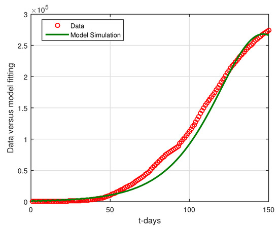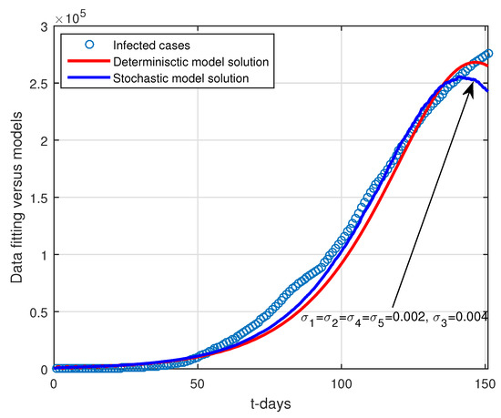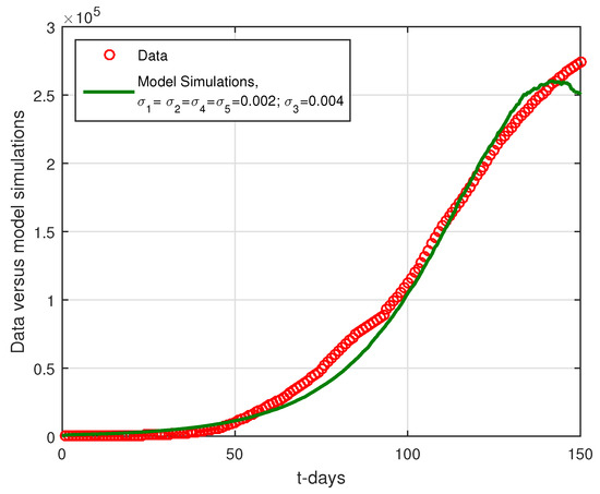 This section studies the estimation of the parameters for the model using the nonlinear least square curve fitting method. The data is considered for the infected cases of COVID-19 in Saudi Arabia. The cases are available in worldometers [37]. We consider the cases per day, thus, we consider the time unit given by per-day. Among these model parameters, we consider the demographic parameters of birth and the natural death rate that are obtained using estimations while the rest of the parameter values have been obtained through model fitting to the data. The stochastic model (3) is used to obtain the parameter estimations. We consider the infected cases of the Kingdom of Saudi Arabia of coronavirus infection for the period starting March–July 2020 [38] is considered. The total population is considered to be in Saudi Arabia in 2020 [39]. The average lifespan in the Kingdom of Saudi Arabia is given by [40]. The birth rate is determined from the equation which is per day. The initial conditions are , , , . The basic reproduction number obtained through the data fitting is approximate . The graphics for the data fitting are given in Figure 1 and Figure 2, while the parameters definitions and their realistic values are given in Table 1. Moreover, in Figure 1 and Figure 2, the legend “Data” referred to the infected cases while the “Model simulation” is the solution of the model”. Figure 1 is the model versus data fitting in the absence of , for while Figure 2 is the data fitting versus model using and . Figure 3 describes the comparison of stochastic and deterministic models versus infected data. It is clear that the stochastic case provides good results for data compared to the deterministic case. It should be noted that in Figure 1 and Figure 2, the legend “Data” referred to the infected cases while the “Model simulation” is the solution of the model. The fitting with the stochastic case is better than the deterministic case.