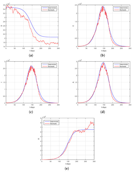 The comparison of stochastic and deterministic model. For the stochastic model, we consider the values , , . Subfigures (a–e) represent, respectively, the comparison of healthy, exposed, symptomatic infected, asymptomatic infected and the recovered with and without stochastic noise.