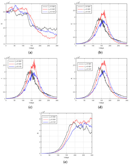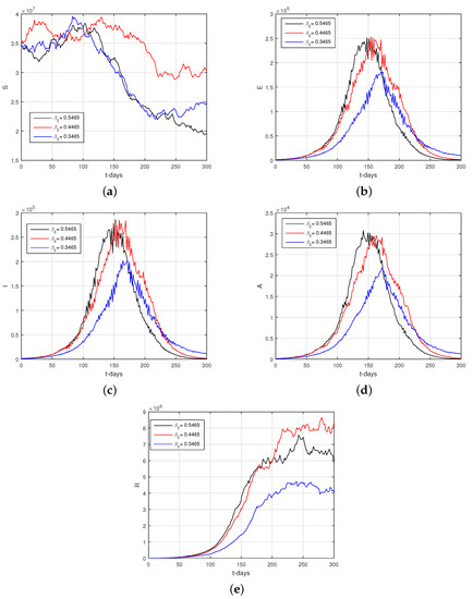 The impact of the parameter on the stochastic model. Subfigures (a–e) represent, respectively, the dynamics of susceptible, exposed, symptomatic, asymptomatic and recovered population under different values of the parameters .