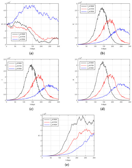 Figure 6 gives the simulation of the stochastic model for many values of the parameter . We can obtain a better decrease if the contact among healthy and symptomatic individuals is decreased, so can decrease best the number of infected cases caused by the symptomatic infected individuals.