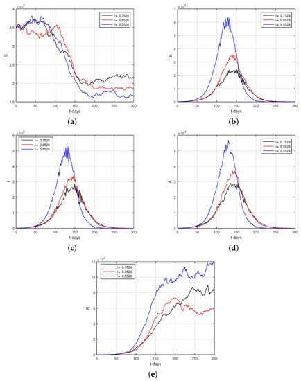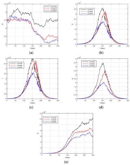 The plot shows the simulation with for the stochastic model. Subfigures (a–e) represent, respectively, the dynamics of susceptible, exposed, symptomatic, asymptomatic and recovered population under different values of the parameters .