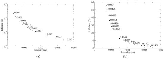 The resonances were described in the ‘two state model’ to obtain the physical quantities as follows: position and width of the bound and autoionizing state, laser frequency at LIDS, Fano parameter. The laser intensity was varied only slightly above the first ionization threshold so that the atom remained in the Floquet eigenstate connected to the initial state. Detailed results are presented in Refs. [,]. In the present work, we complete previous data sets for laser frequency ω >> |E0(α0)|, where |E0(α0)| is the binding energy of the state of the atom in the field, and in which α0 can take any value [,]. In this high-frequency regime, and for a linearly polarized field, RMF results show that as α0 increases, the binding energy decreases. In Figure 1a,b, our results are plotted on the Floquet lifetime as a function of intensity, associated to the 1s22p10s (1Po) and 1s22p6s(1Po) Rydberg state, respectively, in C2+.The numbers adjacent to the points give the corresponding value of α0, the classical amplitude of the oscillation of a free electron driven by the field.