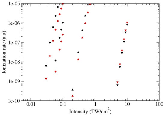 Calculated ionization rate (in atomic units, au) of the 1s22pns (1Po), n = 6, 7, 9, 10, Rydberg states of C2+ as a function of laser intensity (in TW/cm2). There are two curves associated with each state, black and red, corresponding to the ADK and Krainov formulas; n = 10 (circles), n = 9 (diamond), n = 7 (triangle up), n = 6 (triangle down), respectively.
