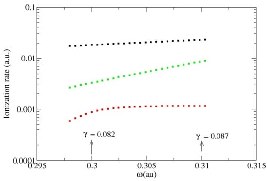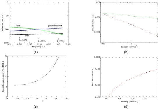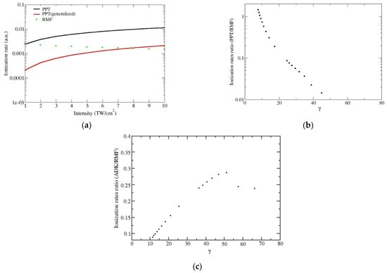 To quantify the deviation between the PPT, ADK, and the RMF theoretical approaches, we used the ratio between the corresponding ionization rate for each two data sets, and the results are plotted versus γ in Figure 5b and Figure 5c, respectively. We conclude that, for our atomic system, the results obtained with the ‘generalized’ model of Perelemov–Popov–Terent’ev are the closest to the ab initio R-matrix Floquet calculation.