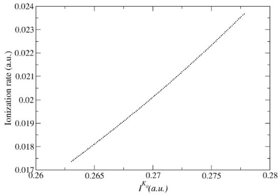 It has been mentioned that, when γ >> 1, scaling of the ionization rate with the incident laser-field intensity, I, is IK0 (with K0 = [Ip/ω]). The PPT calculation carried out for all atomic states considered in this work led to the value K0 = 1, confirming the number of Floquet blocks used in the RMF calculation. We exemplify this dependence in Figure 4 for the ionization from the 1s22p8s(1Po) Rydberg state at a constant field intensity of 1 TW/cm2.