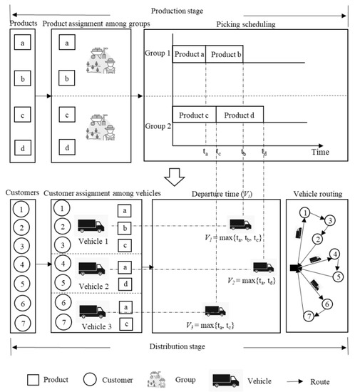 Two pivotal stages are contained in the problem under consideration: the picking stage and the distribution stage. There are multiple picking groups with different picking speeds in the picking stage. A variety of agricultural products must be assigned among groups, and each product may only be assigned to one group. All products assigned to a group are picked by the group following the determined sequence. A group can pick only one product at a time, and interruption is not permitted.