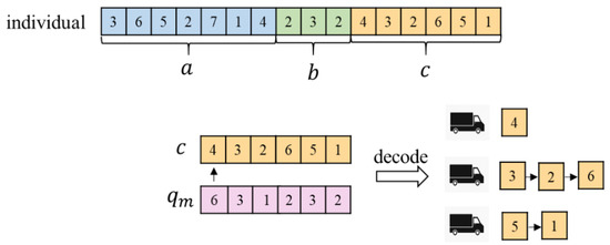To solve the integrated picking and distribution problem, we need to make four decisions, i.e., the product assignment among groups, the picking sequence of the products at the picking stage, the customers served by each of the vehicles, and their delivery routes at the distribution stage. Thus, this work uses an integer string to represent a solution, i.e., a chromosome which consists of three parts. Part represents the picking sequence, where each integer indicates a product index. Part denotes the product assignment among groups, where each integer indicates the number of varieties picked by each group. Through parts and , we can clearly know which group picks which agricultural product and the picking sequence within each team. As is shown in Figure 2, group 1 picks two products in the order of product 3 and 6, group 2 picks three products in the order of product 5, 2, and 7, and group 3 picks two products in the order of product 1 and 4. Part indicates the distribution sequence, where each integer indicates a customer. Notice that Part just gives the delivery sequence of the customers and fails to provide the customer assignment among vehicles. This work employs a decoding rule for Part to minimize the number of vehicles [43]. In this method, the customers are sequentially assigned to a vehicle as their delivery sequence. If the load of a vehicle exceeds the maximum capacity, a new vehicle comes into use. Figure 2 illustrates the decoding rule. The capacity of the vehicle is set to 6. Thus, vehicle 1 serves customer 4, vehicle 2 severs three customers in the order of customer 3, 2, and 6, and vehicle 3 severs two customers in the order of customer 5 and 1. It is worth mentioning that the above encoding method avoids the generation of infeasible solutions.