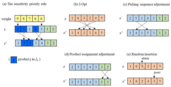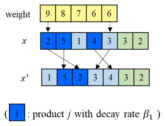 The Sensitivity Priority Rule: In a group, all products are divided into two types and according to their decay rate. The products in are more sensitive to time and are sorted in non-decreasing order according to picking weights. The products in are less sensitive to time. Then the group first picks the products in as their original picking sequence, and finally picks the products in as their sorted sequence. The details are presented in Figure 3.