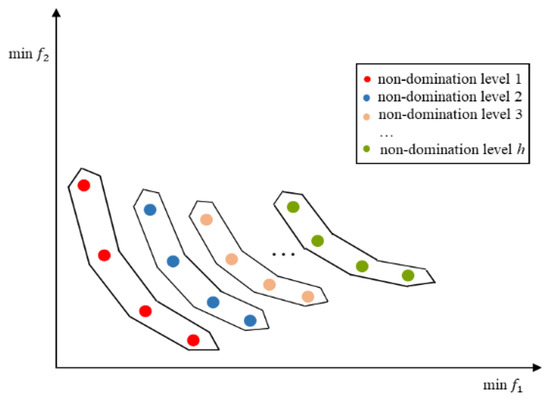 The solutions obtained in this work are called non-dominated solutions, i.e., Pareto solutions, because they simultaneously optimize two conflicting criteria. Thus, Fast Non-dominated Sorting (FNS), a crucial component of NSGA-II, is employed to sort a population into different non-domination levels [9], as is shown in Figure 4. The considered problem is designed to minimize the picking and distribution cost and maximize the freshness of the orders. In the process of calculation, we take the reciprocal of the value of the second objective function. Then a population in MOPGA-LS can be sorted into different non-domination levels ,,…, . Based on this, we can perform a global search and local search, respectively, in different non-domination levels, i.e., perform a global search in all non-domination levels and perform a local search in non-domination level 1. Furthermore, the MOPGA-LS utilizes multiple non-domination levels to improve genetic operation. In short, it performs crossover operations on more promising solutions to enhance the algorithm’s efficiency. The details are as follows.