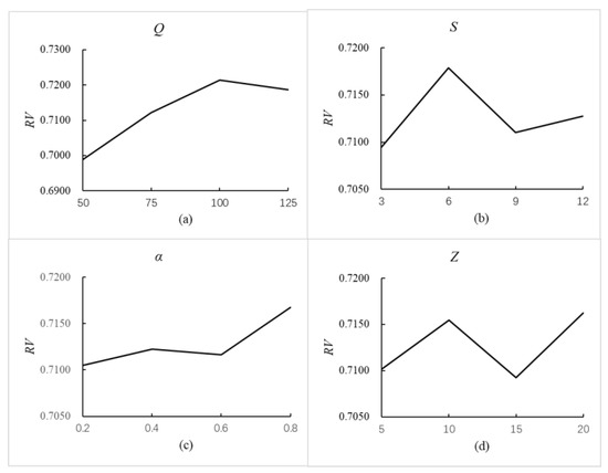 This experiment selects the hypervolume-metric as the performance metric [39]. The bigger the hypervolume, the better the obtained non-dominated solution set. The MOPGA-LS runs 20 times for each parameter combination independently, and the response value (RV) is calculated according to the average Hypervolume value over 20 independent runs. Additionally, the termination criterion, namely the maximum number of function evaluations, is set to , where represents the number of groups, represents the number of products, and represents the number of customers. The results of the orthogonal experiment are displayed in Table 4, and the parameters’ significance rankings are depicted in Table 5. Figure 7 illustrates the factor level trend of each parameter vividly. Based on these findings, we conclude that is the most important parameter and has minimal impact on the algorithm’s performance. Therefore, we conclude that, when and , the MOPGA-LS performs best.