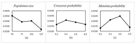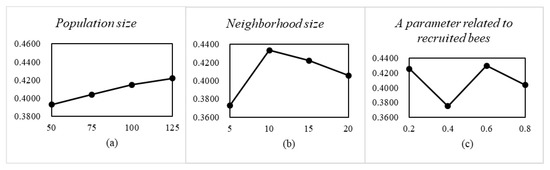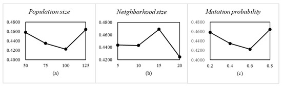 The optimal parameter combination of NSGA-II, MOEA/D, and MOEA/D-BA is also determined by the orthogonal experiment. In NSGA-II, the population size, crossover probability, and mutation probability are the three key parameters. The factor level and the experimental result is shown in Figure 8. Therefore, we conclude that when the population size , the crossover probability , and the mutation probability , NSGA-II performs best. In MOEA/D, the population size, neighborhood size, and crossover probability are the three key parameters. The factor level and the experimental result are shown in Figure 9. Therefore, we conclude that when the population size , the neighborhood size , and the crossover probability , MOEA/D performs best. In MOEA/D-BA, the population size, neighborhood size, and a parameter related to the number of recruited bees are the three key parameters. The factor level and the experimental result is shown in Figure 10. Therefore, we conclude that when the population size , the neighborhood size , and the parameter related to the number of recruited bees , MOEA/D-BA performs best.