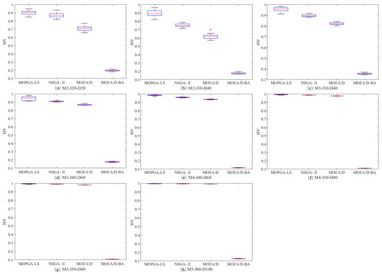This work makes a comparison among four algorithms in terms of their hypervolume-metric and IGD-metric. The experimental results are as follows. Table 6 shows the average of the HV-metric over 20 independent runs of the four algorithms. Though a t-test, we can conclude that the MOPGA-LS greatly outperforms NSGA-II in 28 of the 32 test instances, is equivalent to NSGA-II in the other four, and outperforms both MOEA/D and MOEA/D-BA. Though a U-test, we can conclude that the MOPGA-LS greatly outperforms the NSGA-II in 27 of the 32 test instances, is equivalent to the NSGA-II in the other five, and outperforms both MOEA/D and MOEA/D-BA. In addition, the boxplots of the hypervolume-metric, which vividly show the efficiency of the MOPGA-LS, are shown in Figure 11.