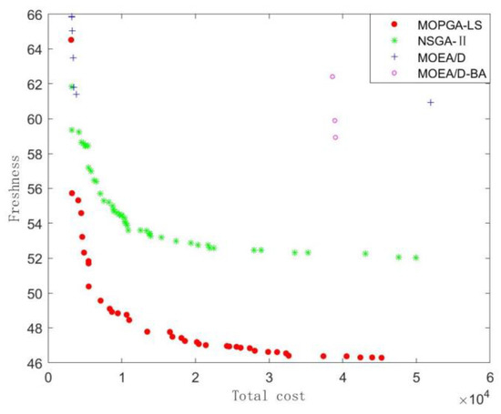 Finally, the distribution of these non-dominated solution sets obtained by the four algorithms in the instance of 3 groups, 15 products with decay rate , 15 products with decay rate , and 40 customers is depicted in Figure 13. It is clear that the solution sets obtained by the MOPGA-LS have superior approximation and distribution to those obtained by the other algorithms. Therefore, we conclude that the proposed algorithm is a superior optimizer for addressing the integrated picking and distribution problem of agricultural products. The experimental results in terms of the hypervolume-metric and IGD-metric show that the MOPGA-LS has better approximation and distribution than other algorithms as peers. The advantages of the MOPGA-LS over NSGA-II, MOEA/D, and MOEA/D-BA illustrate that the multi-population effectively balances the global search and local search. In addition, the improved crossover operation and the combination of local search and the simulated annealing algorithm improve the efficiency of the MOPGA-LS.