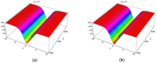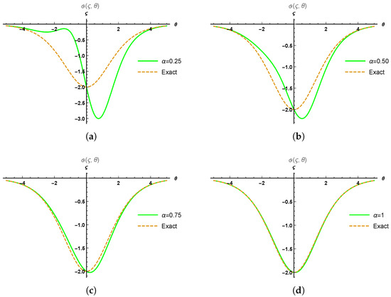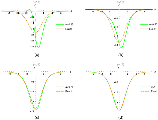 In this part, we provide the results and discussion of time fractional mDP and mCH models to demonstrate the reliability of HPTM through the graphical representations. Figure 1 has been divided into two parts: (a) 3D surface solution of Equation (13) at ; (b) 3D surface solution of Equation (14), where and . Figure 2 represents the physical behavior of mDP model in 2D plot distribution at different fractional order. We divide it into four parts: (a) comparison between the approximate values at and the exact values (b) comparison between the approximate values at and the exact values (c) comparison between the approximate values at and the exact values (d) comparison between the approximate values at and the exact values. We present this comparison at and .